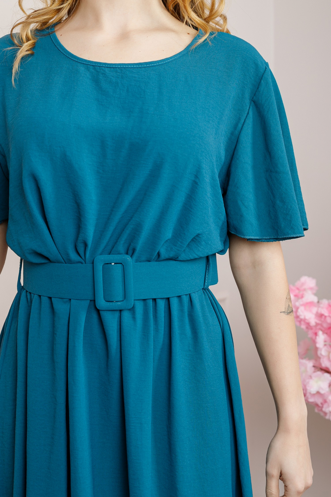 Rochie turcoaz cu centura in talie si maneci scurte. Are croi clos si guler rotund.