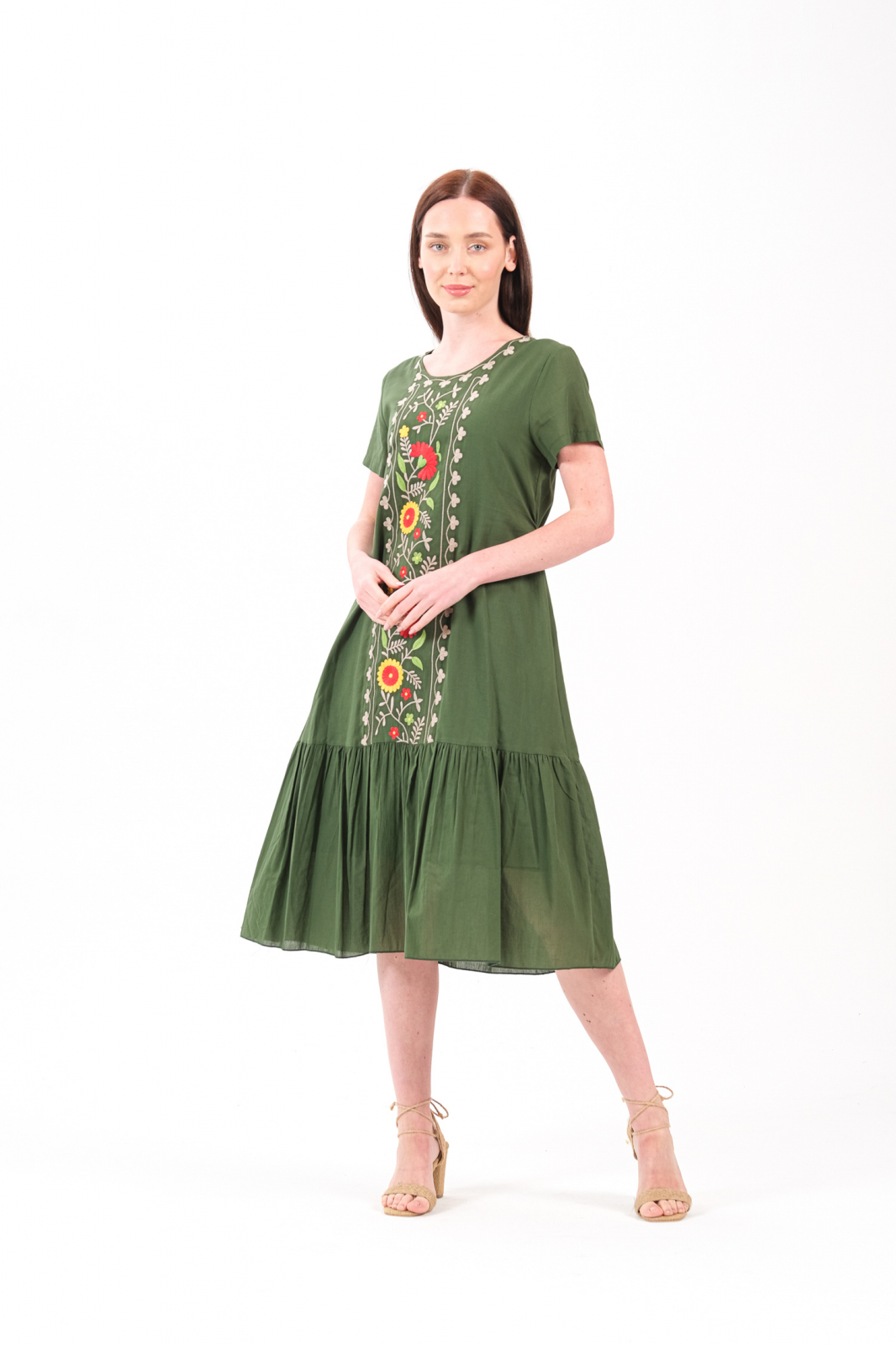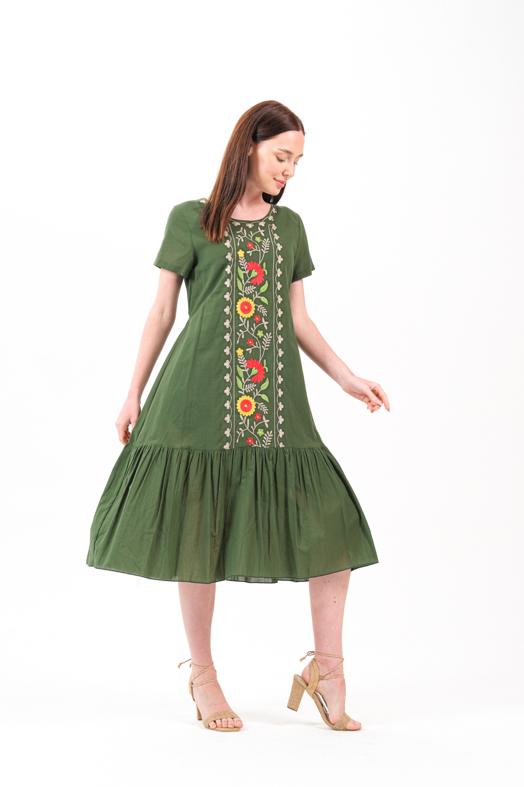 Rochie verde midi boho chic, perfecta pentru zilele insorite de vara. Rochia este decorata cu broderie florala vibranta pe partea din fata, adaugand un aer feminin si elegant. Designul include un snur la spate, care permite ajustarea taliei pentru o potrivire perfecta. Fabricata din bumbac 100%, usor si confortabil, aceasta rochie boho chic este ideala pentru plimbari, festivaluri, evenimente casual sau chiar la birou.