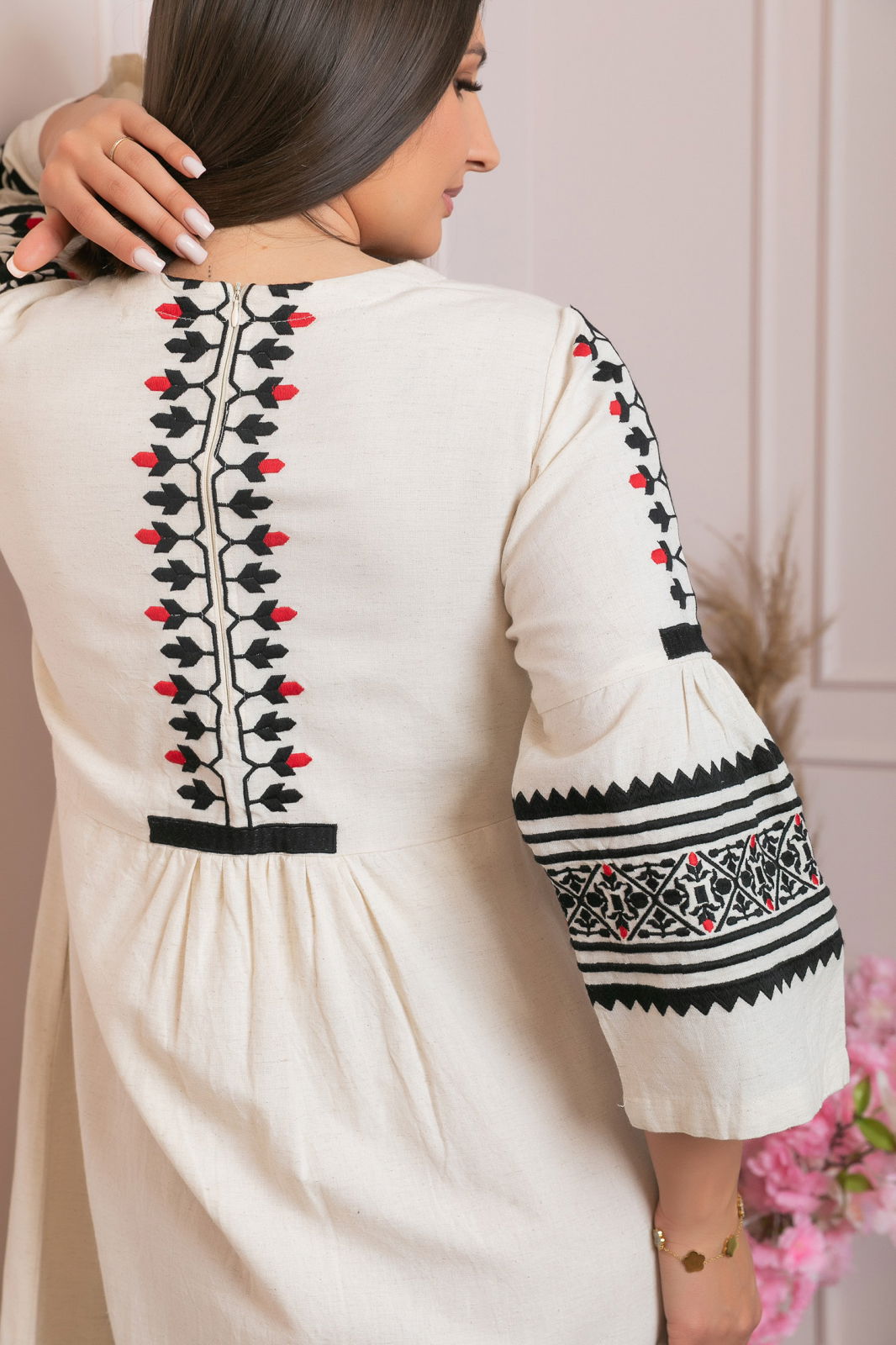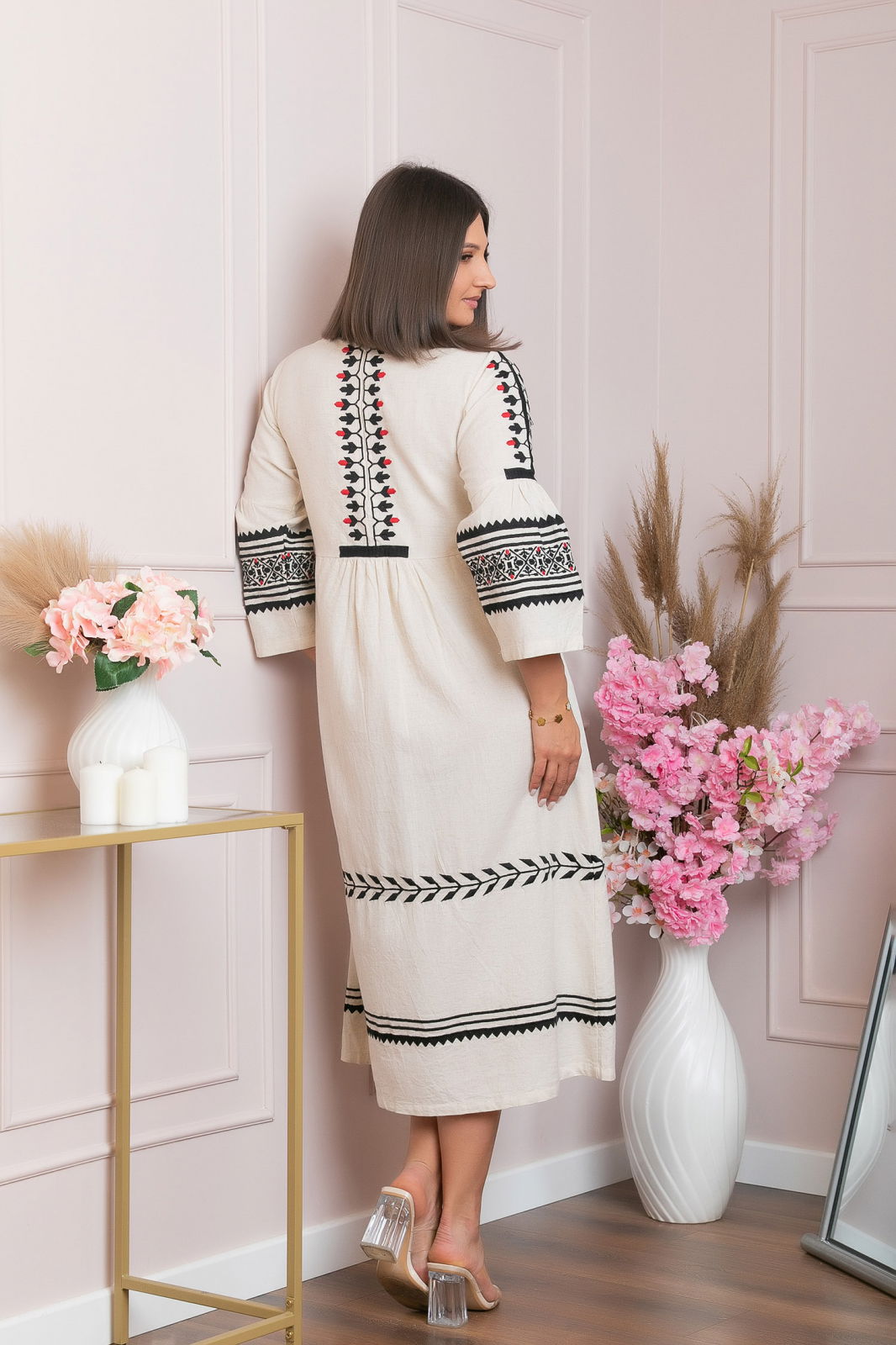 Rochie dama midi crem cu broderie bicolora, de inspiratie traditionala, ideala pentru sezonul cald. Are maneci trei sferturi clopot si decolteu rotund. Rochia este cusuta la masina, are buzunare laterale functionale si dublura la interior pentru extra confort si opacitate. Croiul lejer o face potrivita pentru petreceri tematice, birou, iesiri in oras sau tinute de zi cu zi.