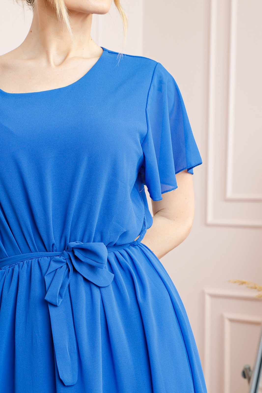 Rochie albastra cu cordon in talie si maneci scurte. Are croi clos si guler rotund.