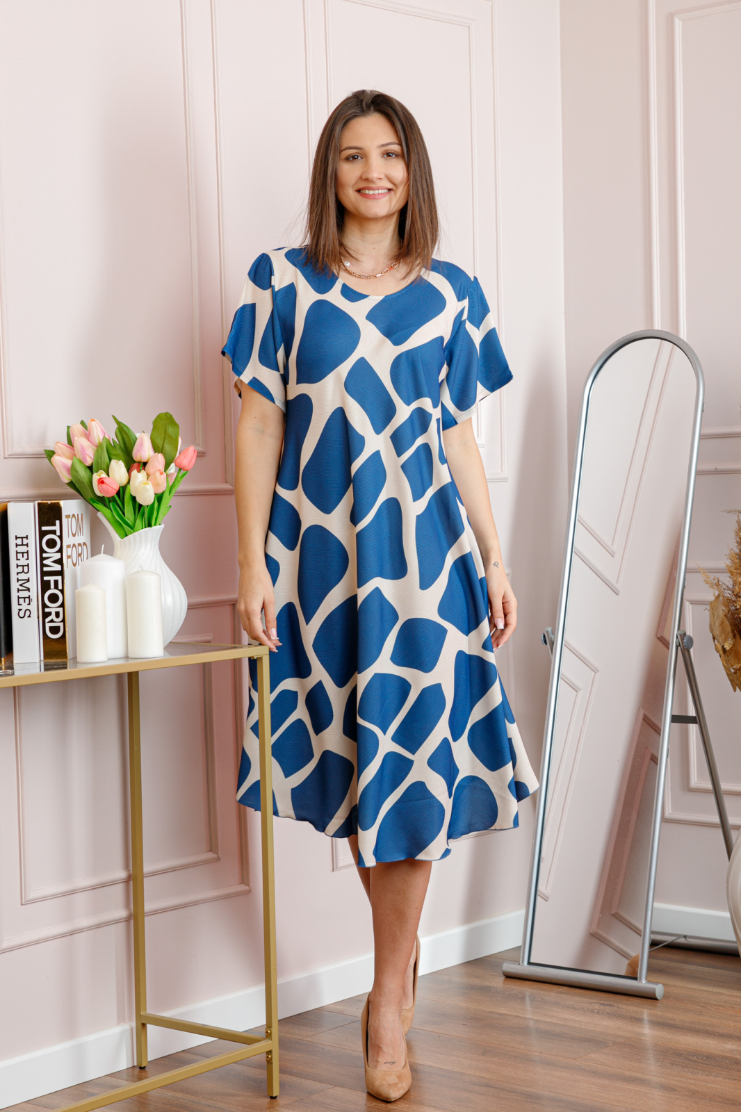Rochia Jany este alegerea perfecta pentru zilele in care vrei sa imbini confortul cu un look feminin si modern. Cu un design fluid si un imprimeu abstract in nuante de albastru si ivoire, aceasta rochie atrage subtil atentia si iti pune in valoare silueta fara efort.