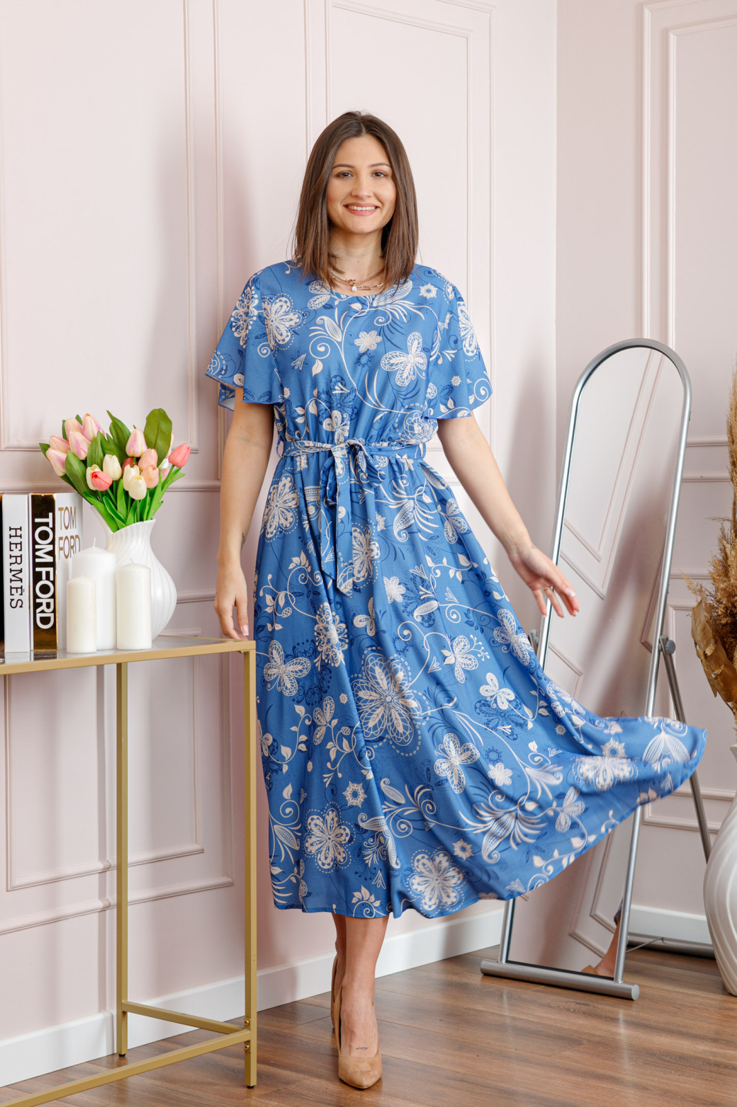 Rochia Artemis imbina eleganta cu un design modern, fiind alegerea ideala pentru tinute feminine, rafinate si usor de purtat. Contrastul dintre bleu si ivoire, in combinatie cu imprimeul floral, creeaza un efect vizual deosebit si actual.