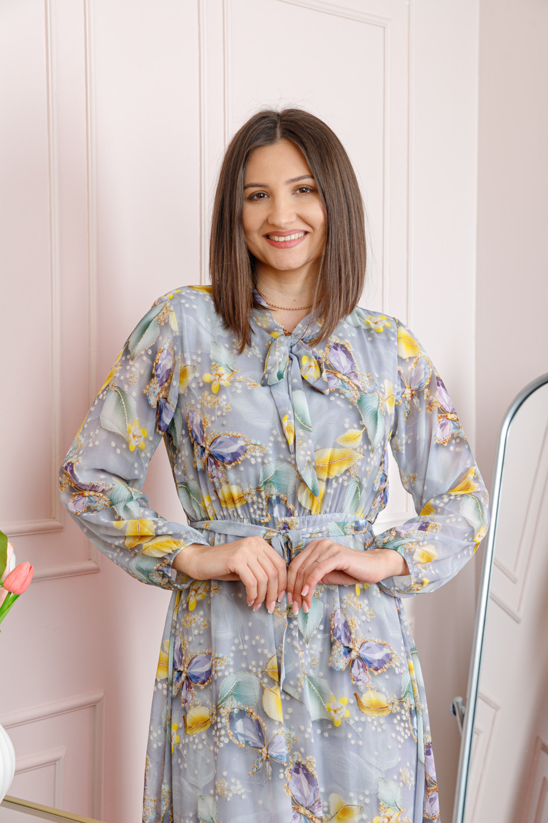 Manecile lungi, usor bufante, sunt finisate cu elastic discret la incheietura, ceea ce adauga un plus de confort si stil. Decolteul este pus in valoare de sistemul de prindere cu funda la gat, un detaliu feminin si sofisticat care completeaza armonios designul rochiei.