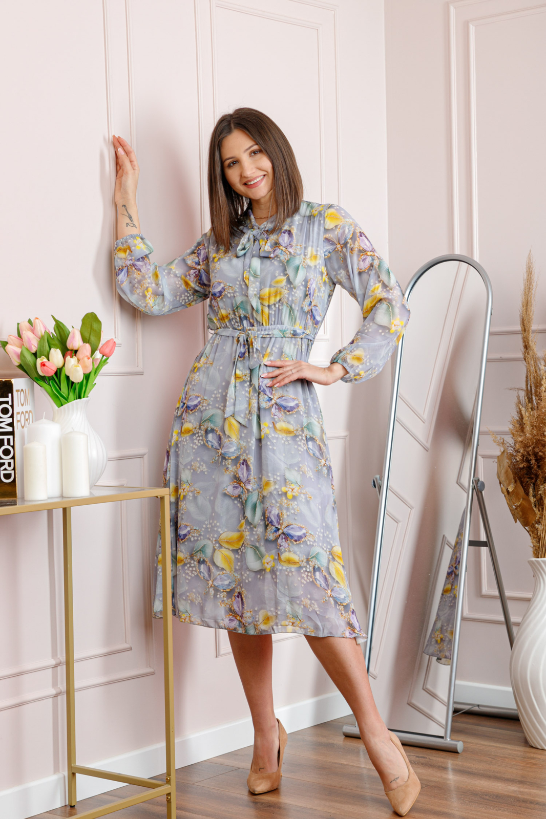 Imprimeul floral in nuante de gri deschis adauga profunzime si un aer romantic tinutei, fiind usor de integrat in outfituri elegante sau casual-chic.