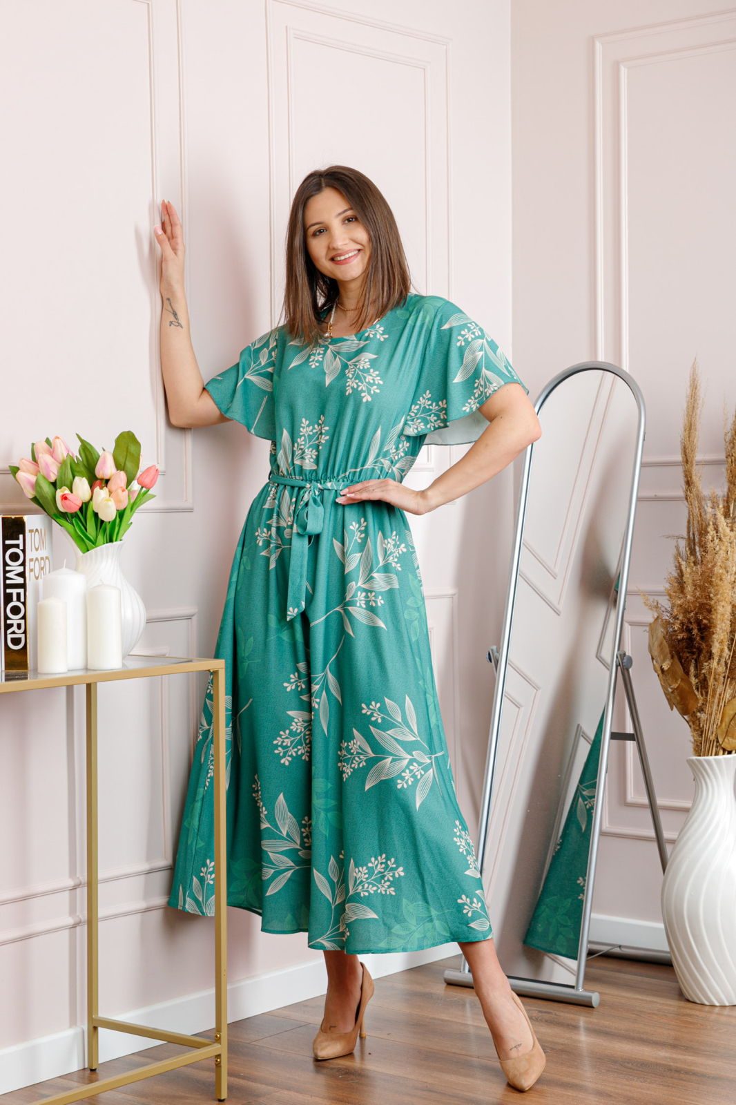 Decolteul rotund adauga un aer clasic si echilibrat, iar manecile scurte, cu terminatie usor evazata, contribuie la un look feminin si relaxat. Baza rochiei este ampla si fluida, cu o cadere naturala care pune in valoare miscarea materialului.