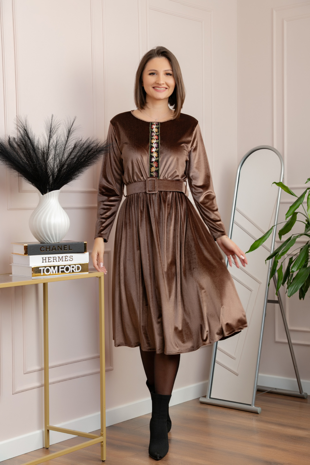 Rochie din catifea Layla cu centura in talie si detaliu boho-floral - Maro