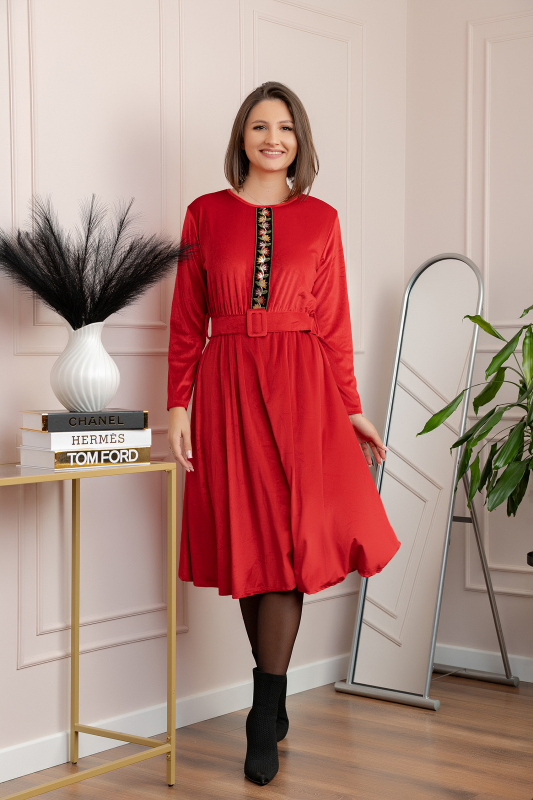 Rochie din catifea Layla cu centura in talie si detaliu boho-floral - Rosu