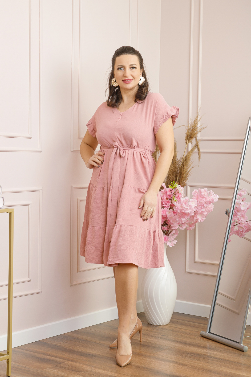 Rochia eleganta roz pastel Rosalie este o piesa vestimentara perfecta pentru orice eveniment sau ocazie speciala. Este realizata dintr-un material opac si are dublura la interior, oferind in acelasi timp un plus de confort. Cordonul din talie evidentiaza silueta, iar decolteul in V cu nasturei decorativi adauga o nota de rafinament. Manecile scurte cu terminatie cu volanas asigura un look feminin, in timp ce partea de jos a rochiei prezinta volane, pentru un aer diafan si romantic. Modelul din imagine are 165 cm inaltime si poarta marimea M.