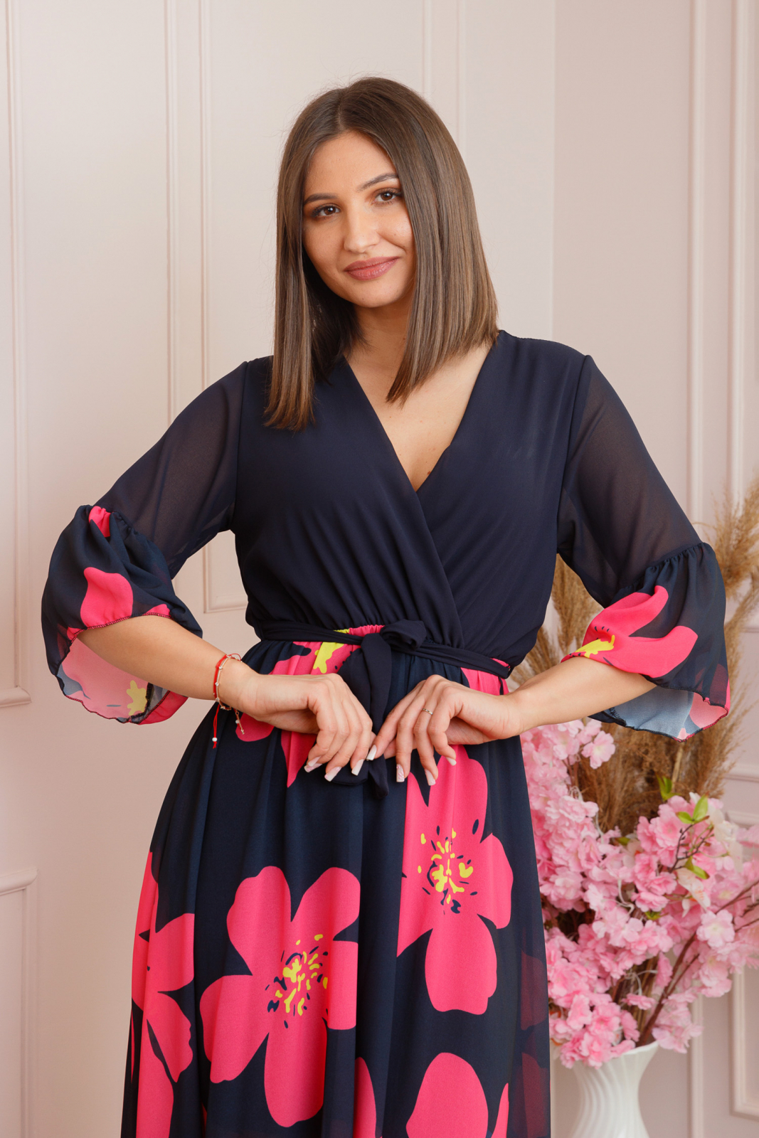 Rochia Lucy este alegerea perfecta pentru evenimente speciale precum nunti, botezuri sau alte ocazii festive. Confectionata din voal fin, cu dublura la interior, aceasta rochie nu este transparenta si ofera un plus de confort. Croiala sa midi avantajeaza orice silueta, in timp ce elasticul si cordonul din talie permit ajustarea perfecta. Decolteul in V, de tip petrecut, pune in valoare bustul, iar manecile trei sferturi lejere, cu terminatie cu volanas, completeaza designul elegant. Acest model de rochie eleganta iti asigura un look sofisticat si feminin, usor de asortat cu pantofi cu toc si accesorii rafinate.