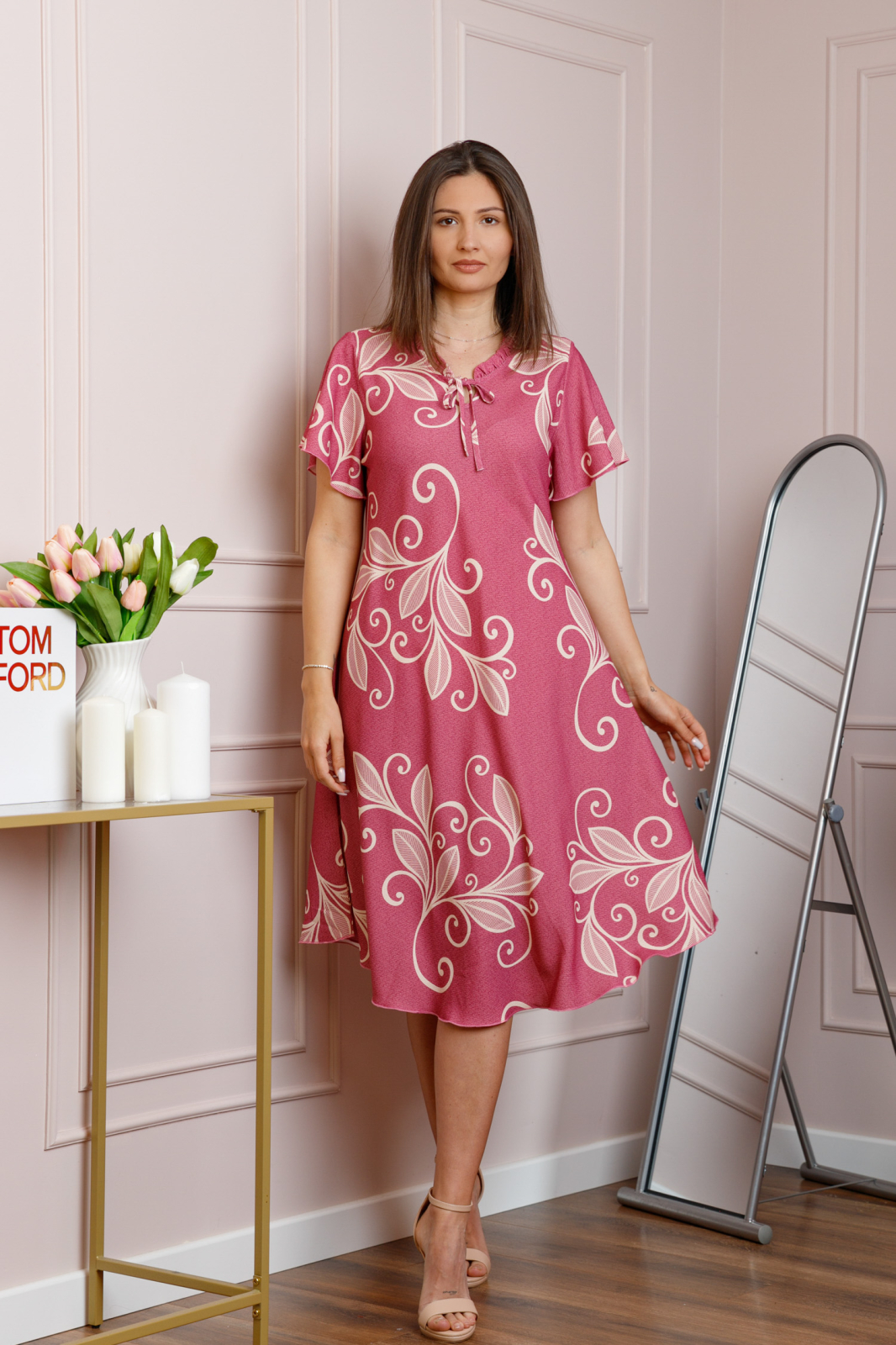 Imprimeul floral evidentiaza stilul romantic al rochiei, fiind usor de integrat in tinute de zi sau aparitii casual-elegante. Decolteul este accentuat de un volanas discret si prevazut cu snur reglabil, care permite ajustarea deschiderii in functie de preferinte.