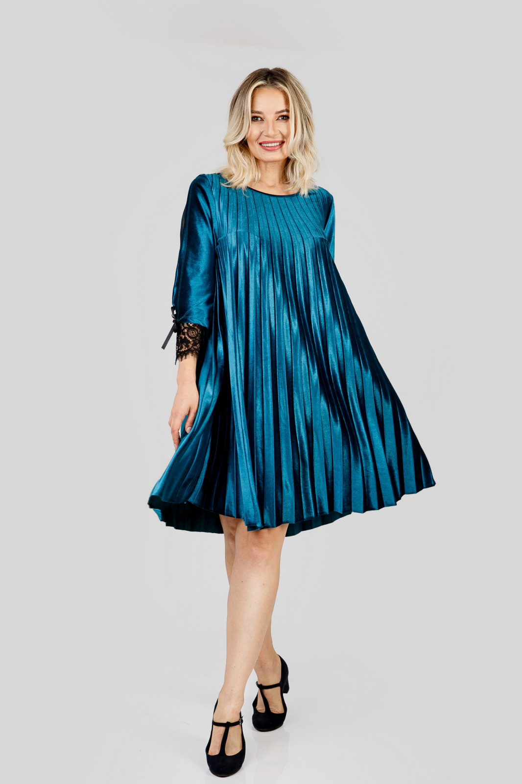 Rochie vaporoasa turcoaz cu croi tip A. Este plisata de sus pana jos, are guler rotund si maneci trei sferturi cu decupaj lateral si insertie de dantela la baza. Rochia este din catifea opaca, plina, care pica greu si nu necesita dublura la interior.