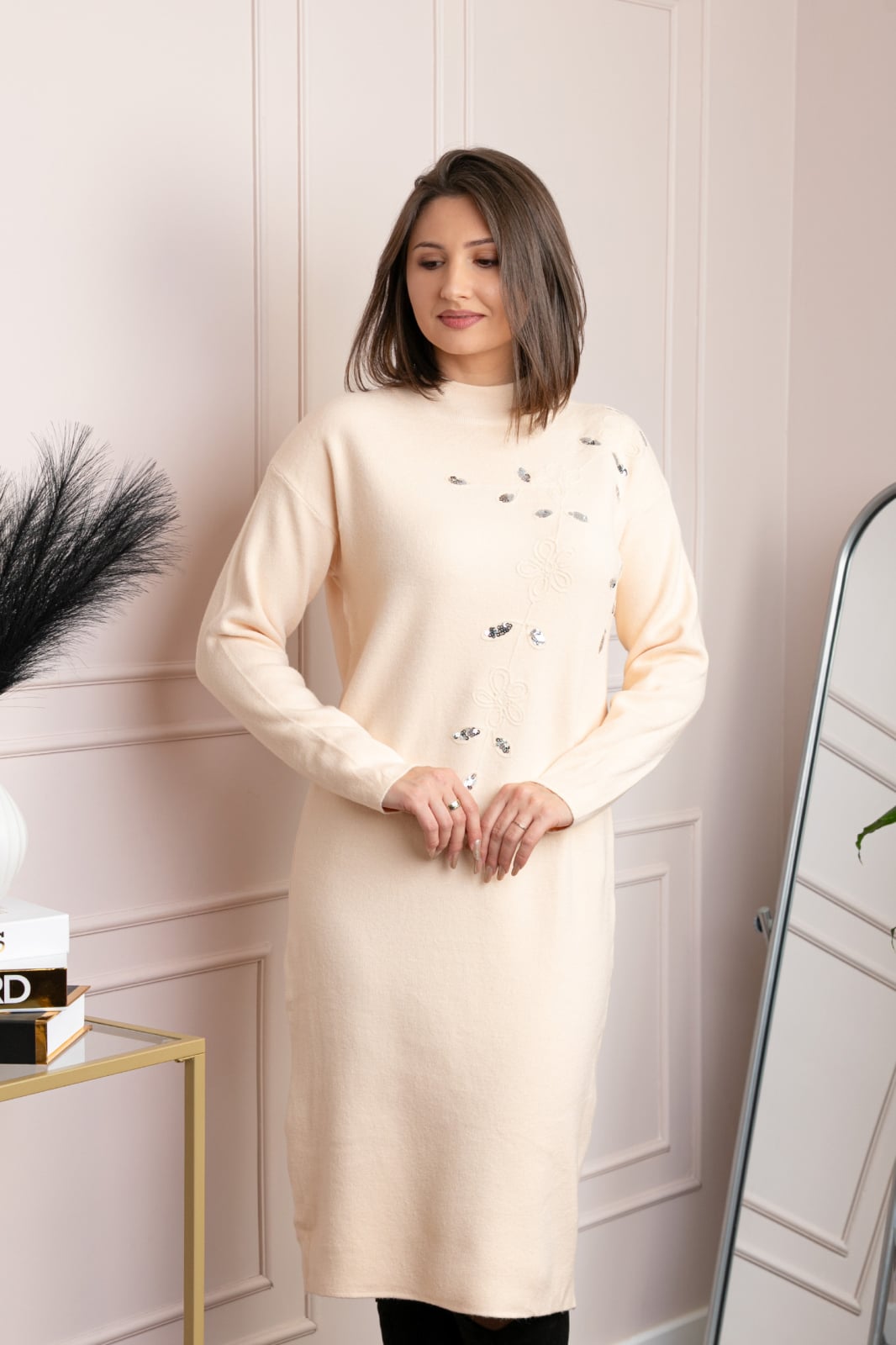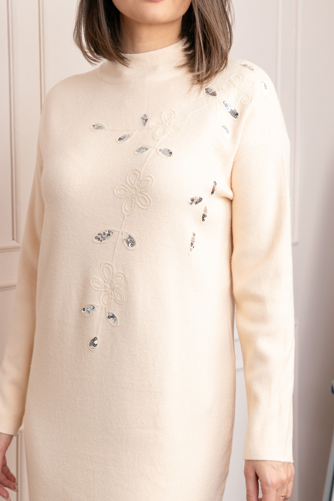 Modelul se remarca prin detaliile rafinate: flori reliefate si frunzulite accentuate cu paiete argintii discrete, ce adauga un strop subtil de stralucire. Croiul drept si linia fluida avantajeaza orice silueta, facand din aceasta rochie o piesa potrivita atat pentru birou, cat si pentru evenimente casual-elegante.