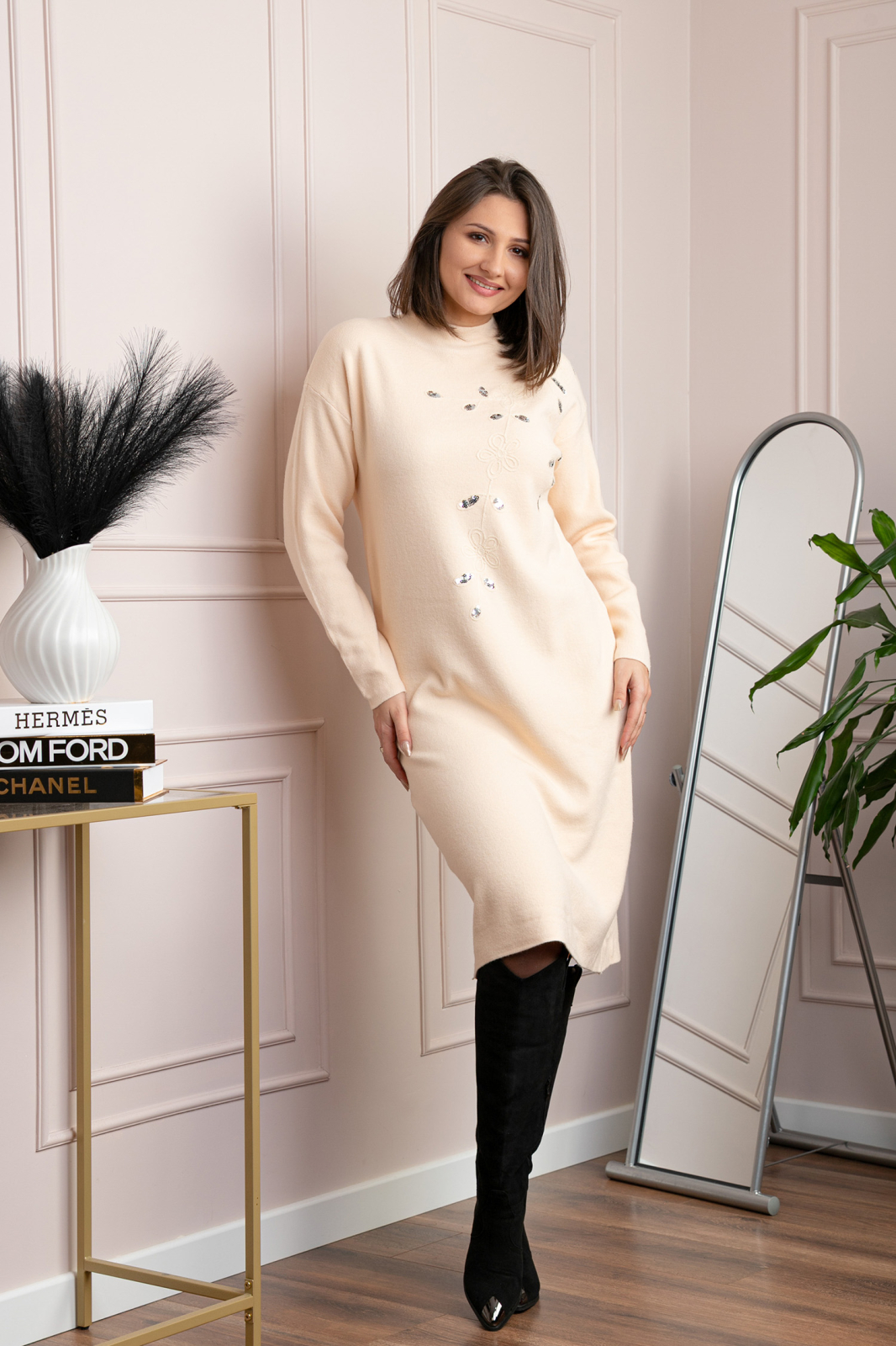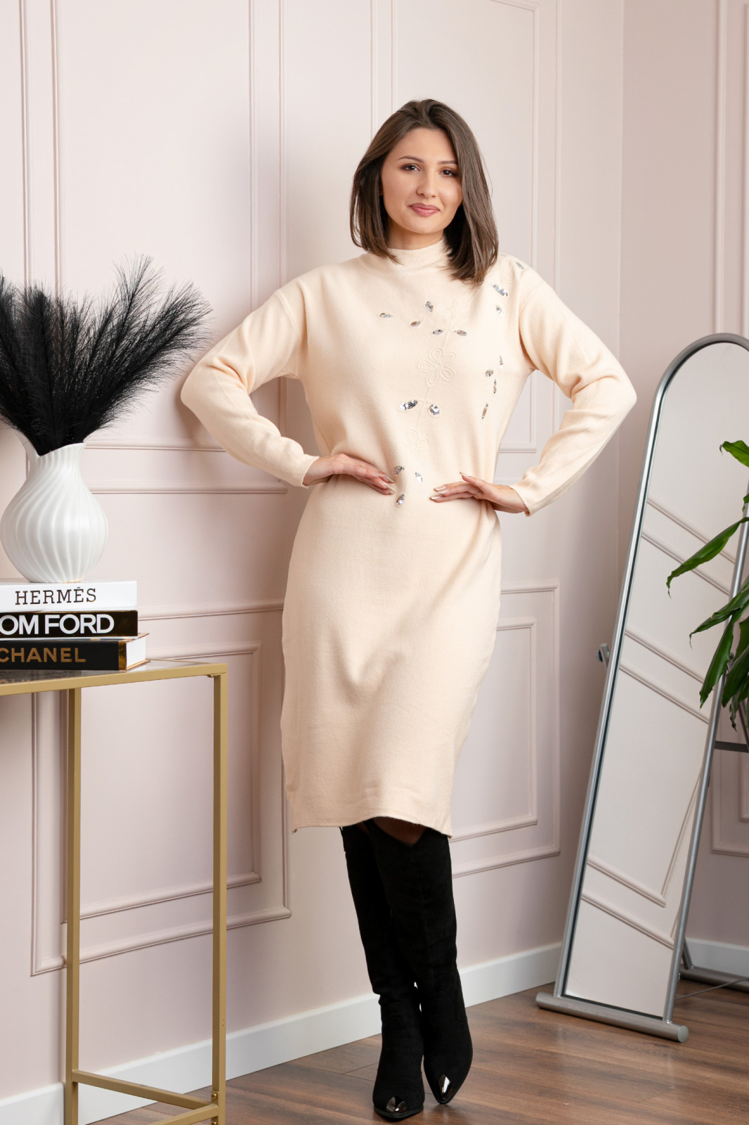 Rochia tricotata Katherine aduce rafinament si confort in acelasi timp. Realizata dintr-o combinatie de materiale premium (60% viscoza, 25% casmir, 10% spandex, 5% lana), ofera o textura catifelata, elastica si placuta la atingere. Este o alegere ideala pentru sezonul rece, datorita croiului lejer si materialului calduros care pastreaza eleganta unei tinute feminine.