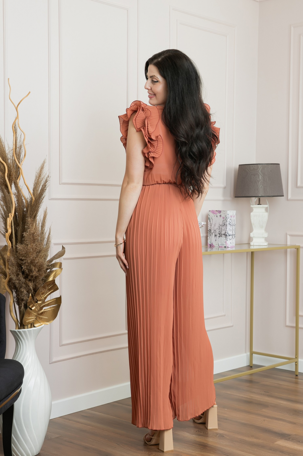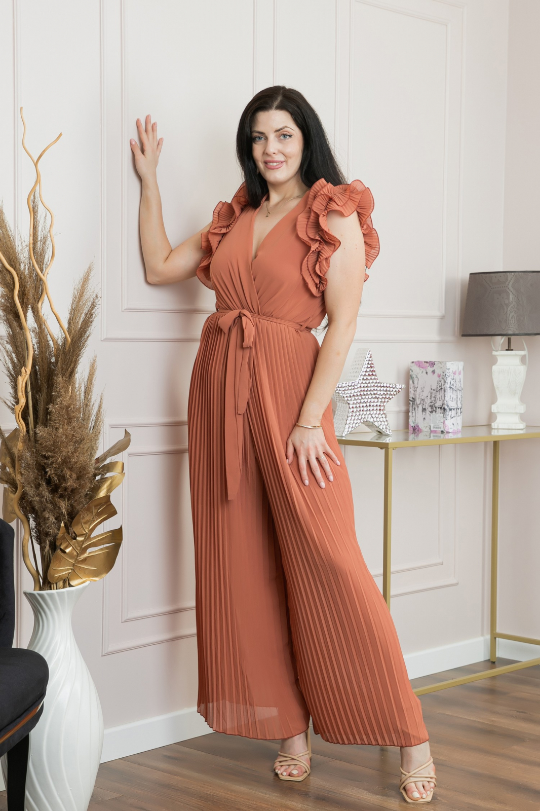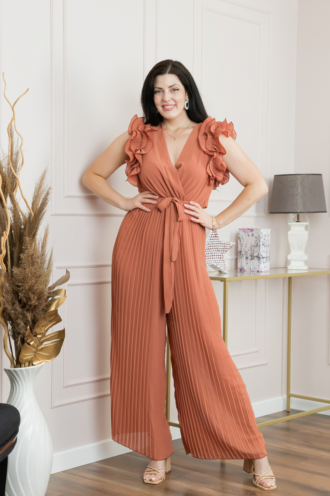 Aceast model de salopeta eleganta este ideal pentru ocazii speciale, adaugand un strop de rafinament oricarei garderobe. Confectionata dintr-un material usor si vaporos, salopeta are volane delicate pe umeri si un cordon in talie care accentueaza silueta. Designul plisat al pantalonilor adauga o nota sofisticata, iar decolteul in V completeaza look-ul feminin si elegant. La interior prezinta dublura la bust si picioare.