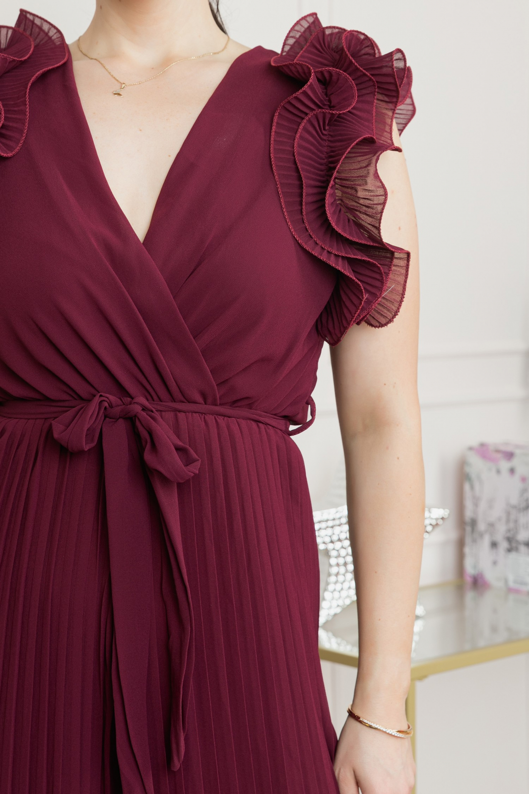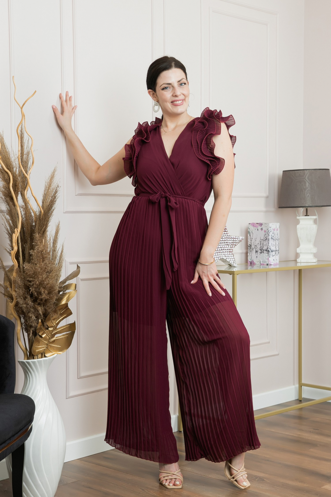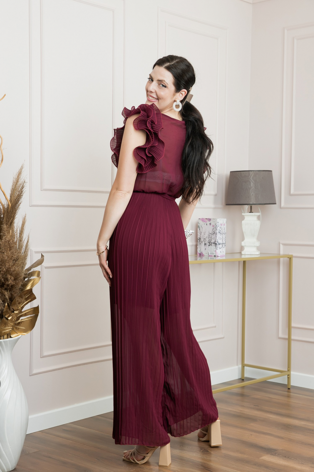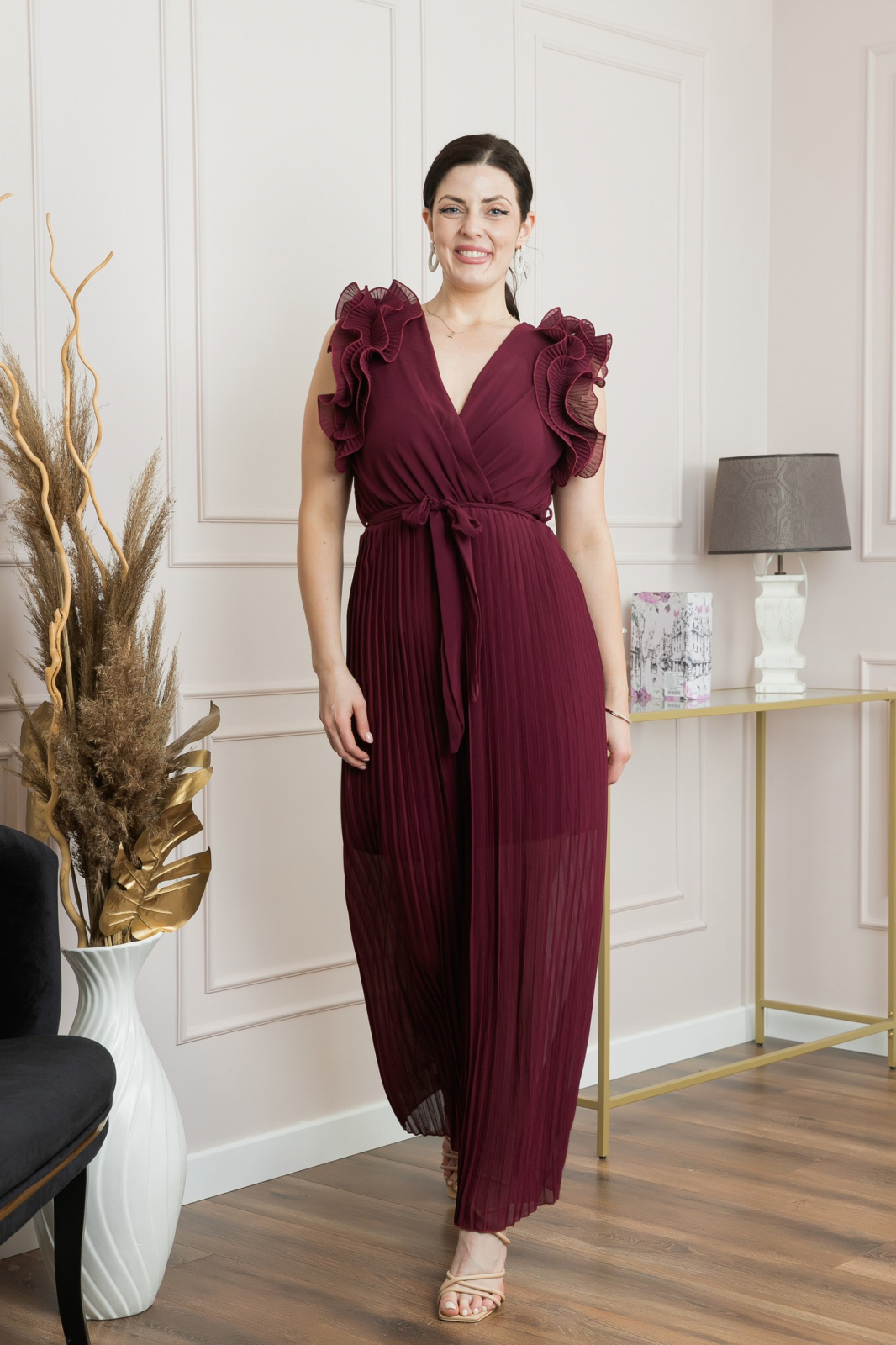 Salopeta grena eleganta cu volane pe umeri si cordon in talie.