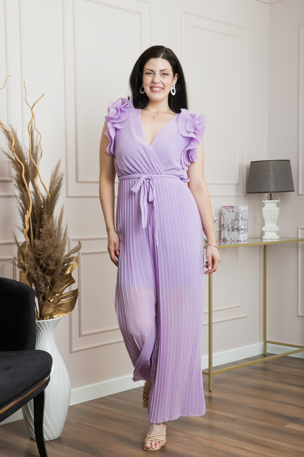Salopeta lila eleganta cu volane pe umeri si cordon in talie.