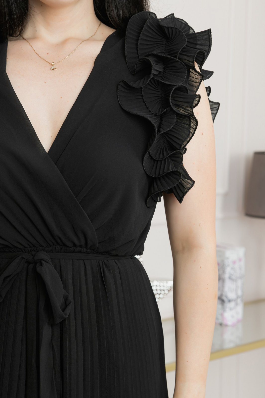 Salopeta neagra eleganta cu volane pe umeri si cordon in talie.