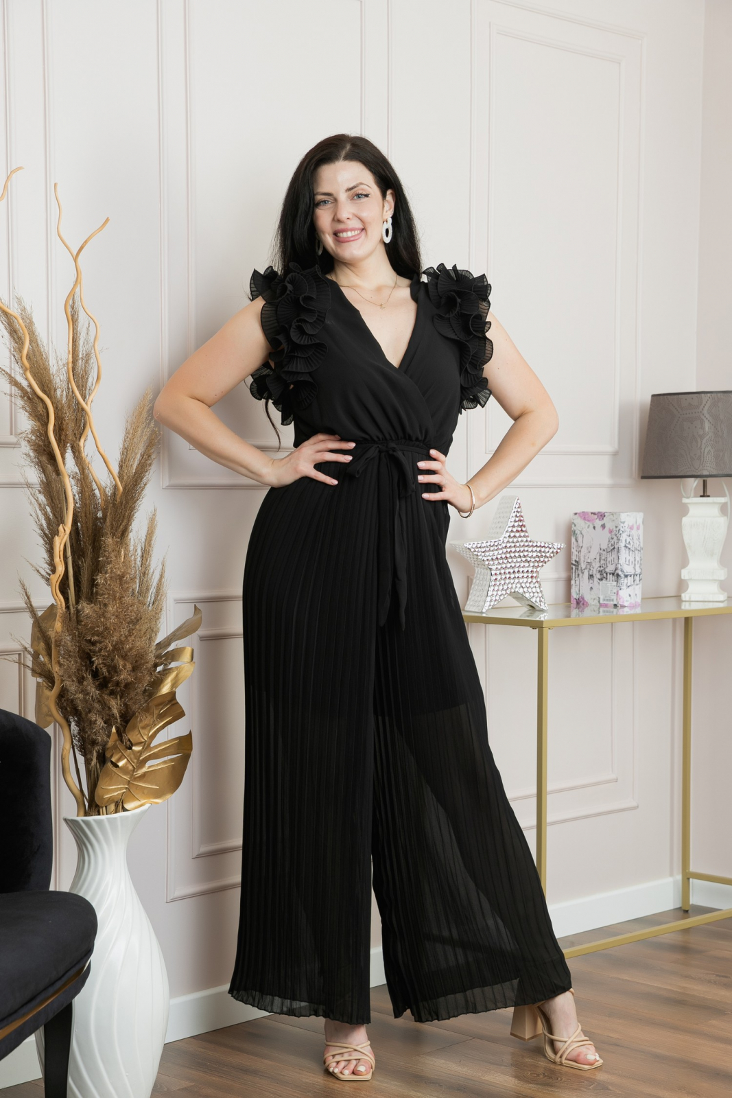 Aceast model de salopeta eleganta este ideal pentru ocazii speciale, adaugand un strop de rafinament oricarei garderobe. Confectionata dintr-un material usor si vaporos, salopeta are volane delicate pe umeri si un cordon in talie care accentueaza silueta. Designul plisat al pantalonilor adauga o nota sofisticata, iar decolteul in V completeaza look-ul feminin si elegant. La interior prezinta dublura la bust si picioare.