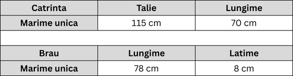 Acest set compus din catrinta si brau aduce un plus de eleganta tinutei fetitei tale. Catrinta, brodata cu dungi fine si motive florale, se petrece usor in jurul taliei si poate fi ajustata pe masura ce copilul creste. Terminatia de dantela ofera un aer delicat si feminin. Braul lat completeaza armonios ansamblul, punand in valoare culorile vii ale broderiei. Croiul lejer asigura libertate de miscare la dans sau serbare, pastrand in acelasi timp un aspect rafinat.