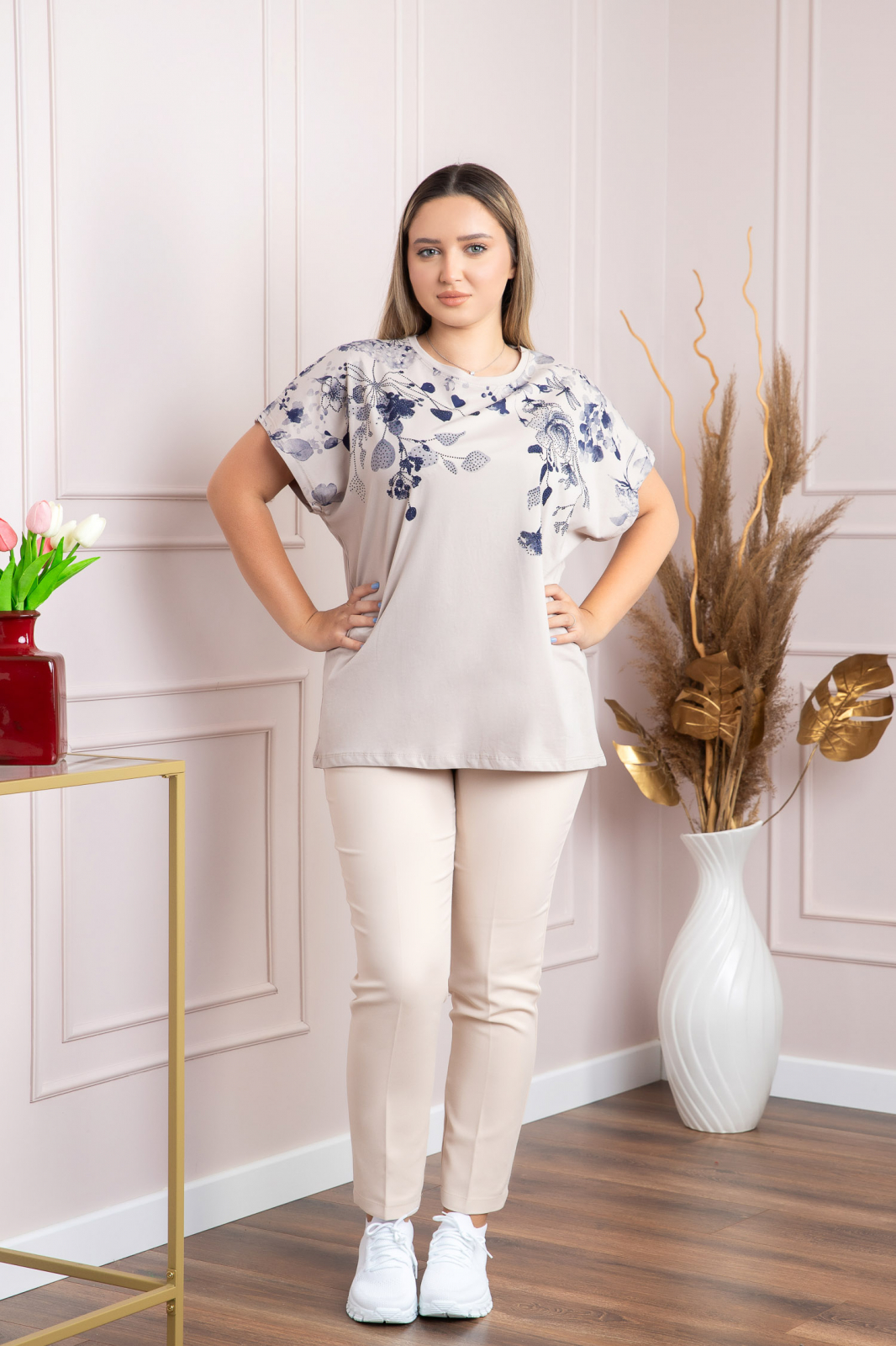 Tricou casual ivoire cu strasuri si imprimeuri florale bleumarin. Acest tricou este realizat dintr-un material confortabil, compus din 95% bumbac si 5% poliester. Prezinta decolteu rotund, maneci scurte si croi lejer, creand un aspect modern si confortabil. Modelul floral imbinat cu strasuri confera tinutei un aer tineresc.