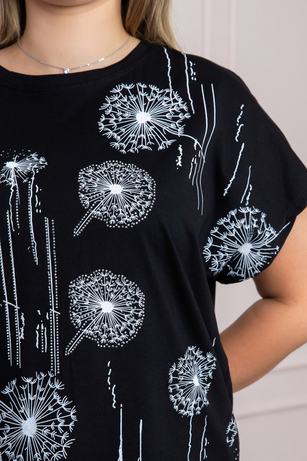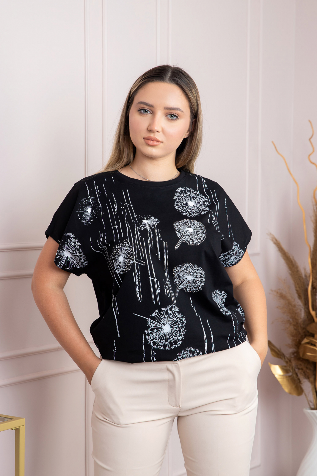 Tricou casual negru cu strasuri si imprimeu floral cu papadii. Acest tricou este realizat dintr-un material confortabil, compus din 95% bumbac si 5% poliester. Prezinta decolteu rotund, maneci scurte si croi lejer, creand un aspect modern si confortabil. Modelul floral imbinat cu strasuri confera tinutei un aer tineresc.