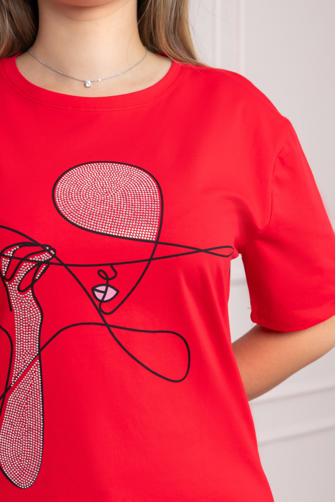 Tricou casual rosu cu strasuri si imprimeuri abstracte negre. Acest tricou este realizat dintr-un material confortabil, compus din 95% bumbac si 5% poliester. Prezinta decolteu rotund, maneci scurte si croi lejer, creand un aspect modern si confortabil. Modelul abstract imbinat cu strasuri confera tinutei un aer tineresc si elegant.