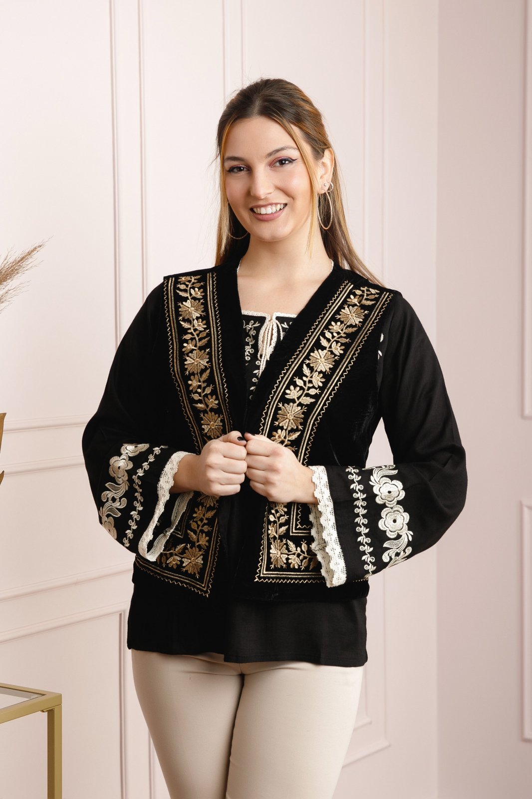 Vesta traditionala neagra din catifea cu motiv floral auriu. Modelul de vesta ofera lejeritate la purtare, intrucat nu prezinta inchidere.