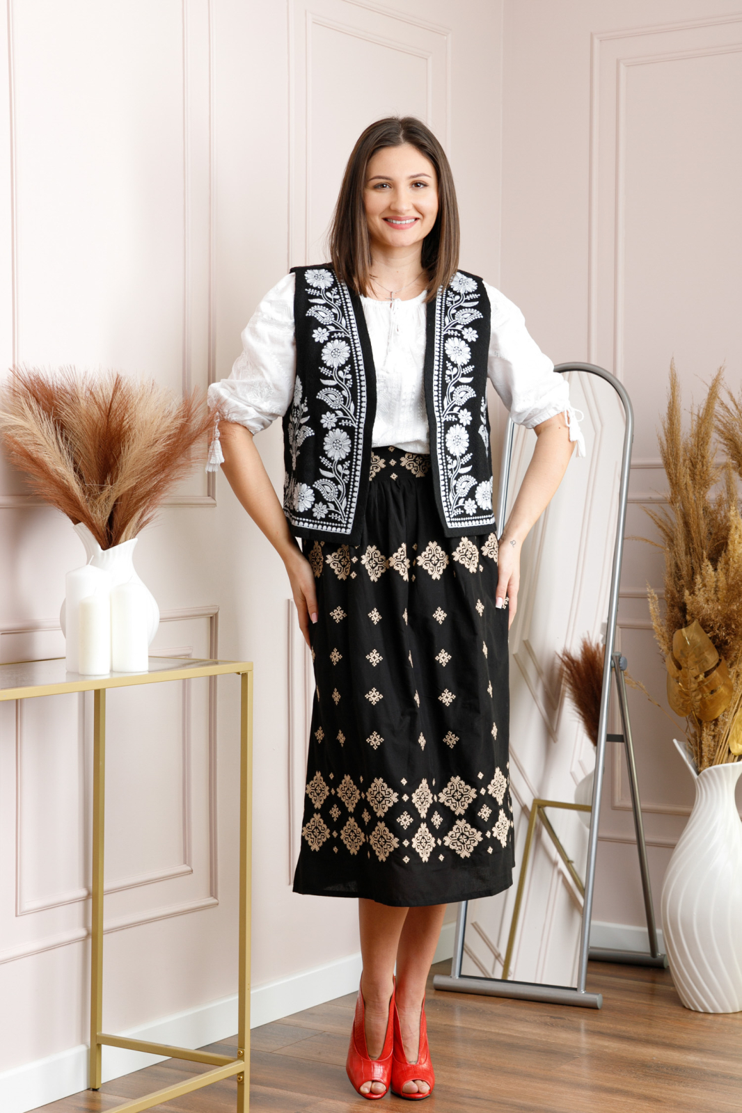 Vesta traditionala neagra din stofa cu motiv floral alb. Modelul de vesta ofera lejeritate la purtare, intrucat nu prezinta inchidere.