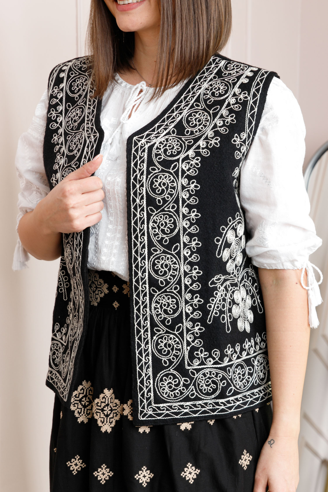 Vesta traditionala neagra cu broderie florala alba Claudia