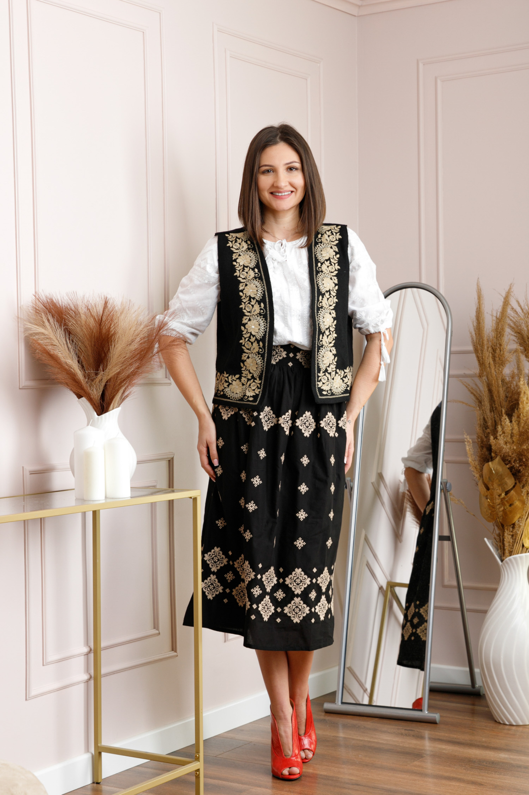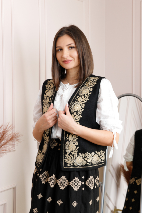 Vesta traditionala neagra din stofa cu motiv floral auriu. Modelul de vesta ofera lejeritate la purtare, intrucat nu prezinta inchidere.