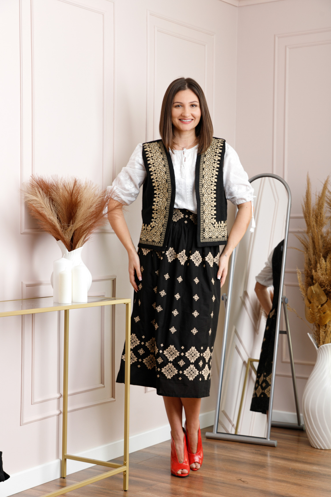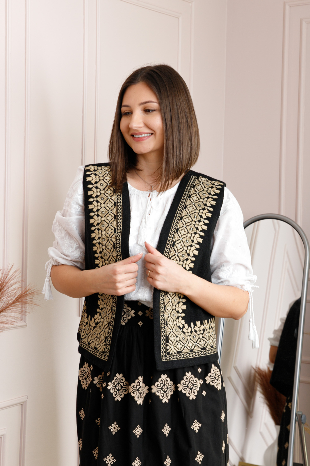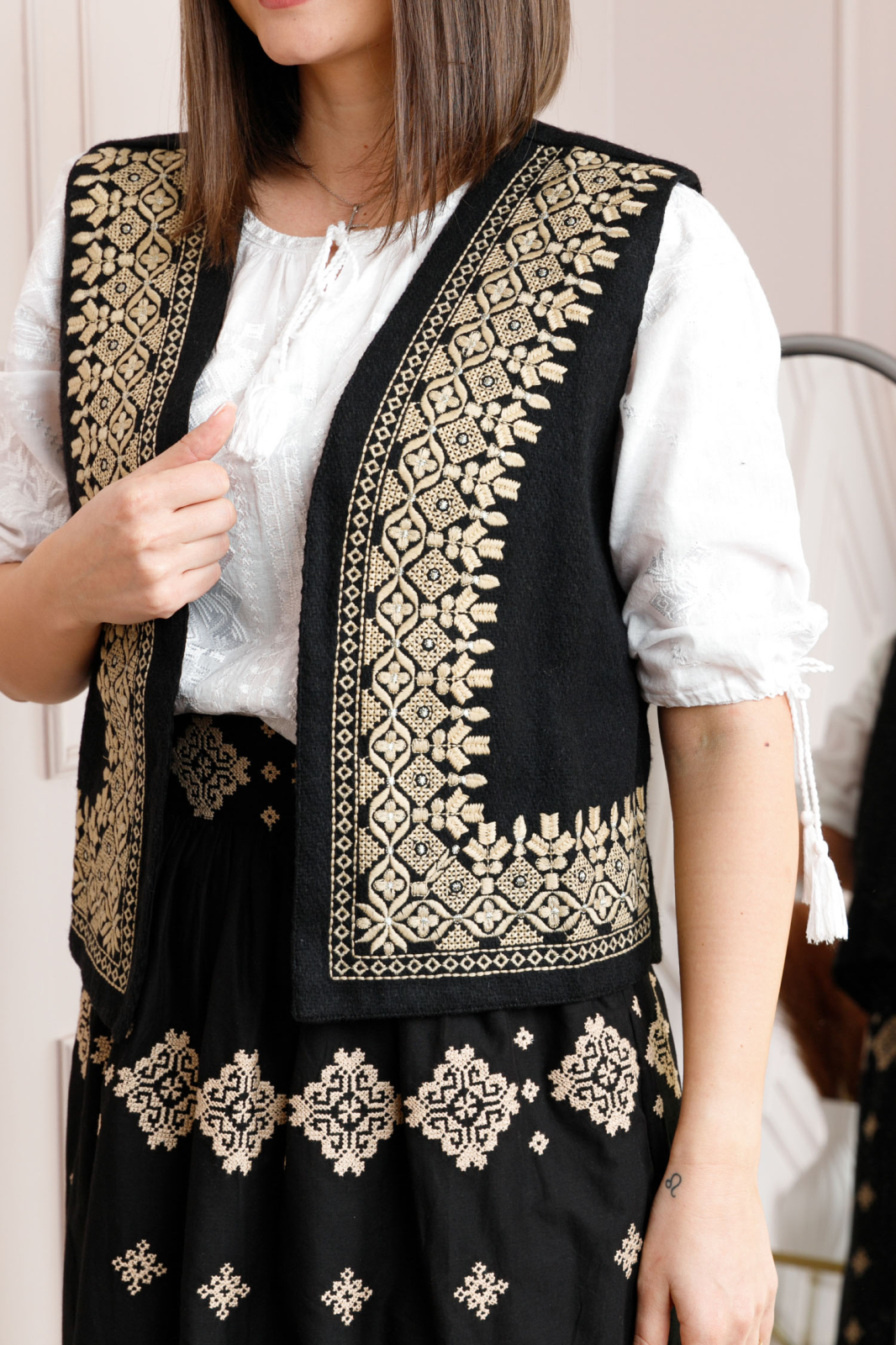 Vesta traditionala neagra din stofa cu motiv geometric auriu. Modelul de vesta ofera lejeritate la purtare, intrucat nu prezinta inchidere.